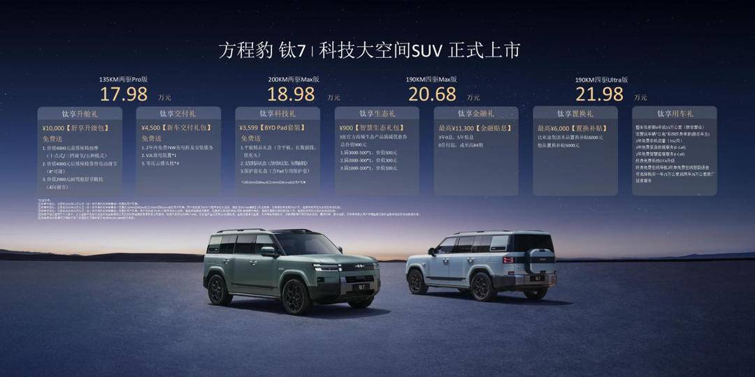而钛7所给予到的惊喜价格和政策,也是诚意满满,售价17.98万元起,4个配置版本,任君挑选,款款越级,款款超值,下单即刻享受最高价值超3.6万元的上市权益,包括提供3年0息、5年低息、0首付起或至高84期等多重金融方案以供选择,金融贴息最高价值11300元等权益,让每一个家庭都能轻松拥抱钛7,让美好生活触手可及。