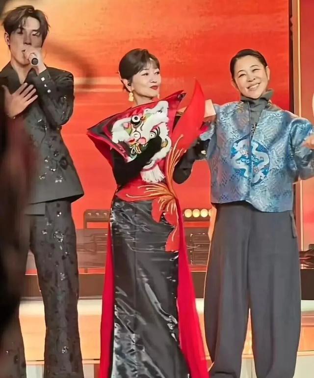 舞台上,66岁的倪萍手舞足蹈,小动作颇多,而赵雅芝则站在一边,大方得体。