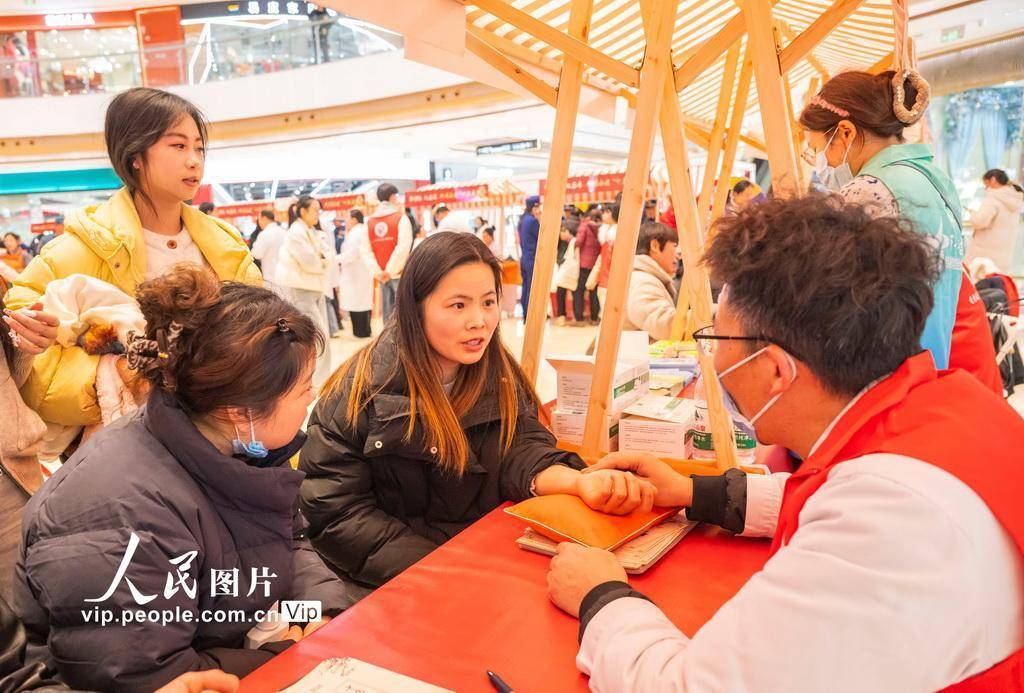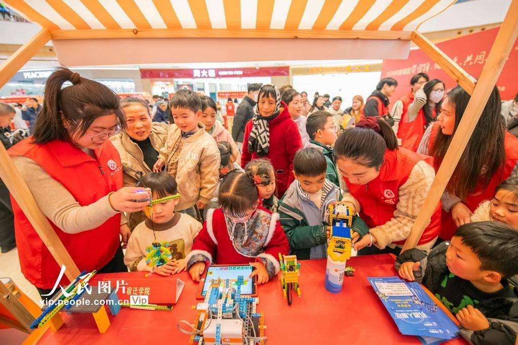 2026年3月4日,江苏省宿迁市宿城区委社会工作部组织20余家志愿服务队、80余名志愿者走进吾悦广场,开展“学雷锋 做志愿 共同奋进‘十五五’”主题活动。现场设置健康义诊、消防宣传、法治宣传、AI科普等20个便民服务摊位,“零距离”服务群众,以实际行动践行雷锋精神。徐江海摄(人民图片网)